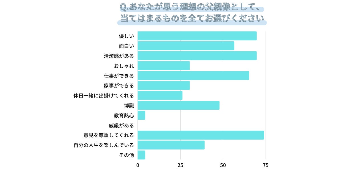 最も多いのが「子どもの意見を尊重してくれる」という回答で、「清潔感」と「優しさ」が続いています。確かに、授業参観に来てくれたお父さんが、服装がダサかったり、髪型に清潔感が出せていなかったら少しイヤですよね。